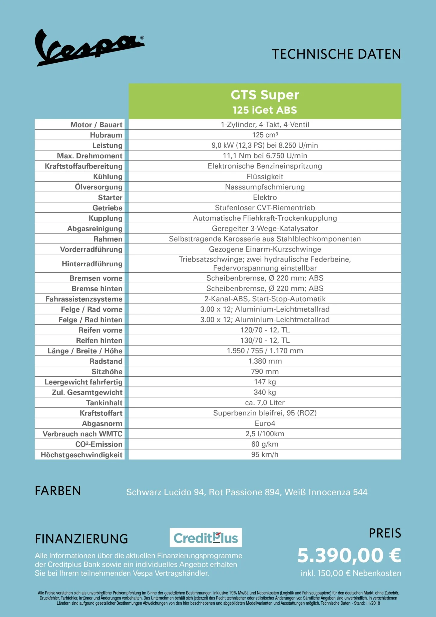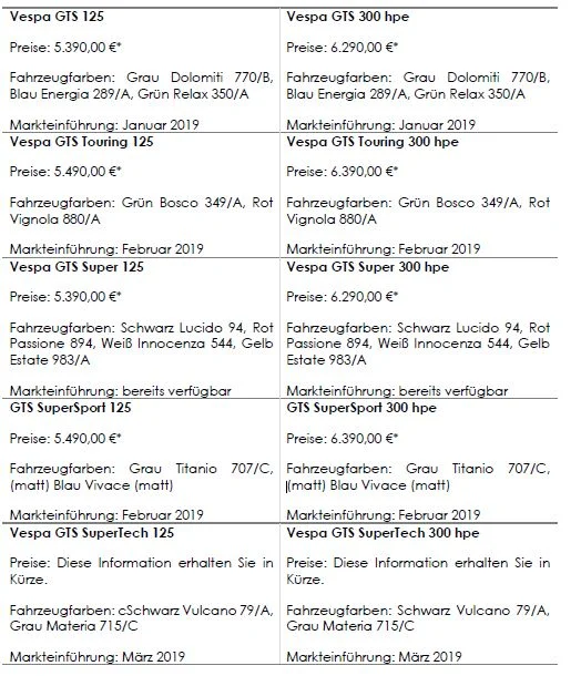 Für die neue Saison erhielt die Vespa GTS-Baureihe hinsichtlich Komfort, Leistung und Styling einige Updates und Verbesserungen. Insgesamt stehen 2019 fünf GTS-Modelle zur Auswahl: Vespa GTS, GTS Touring, GTS Super, GTS Super Sport sowie die brandneue Vespa GTS SuperTech. Alle Modelle sind in zwei Hubraumklassen erhältlich.